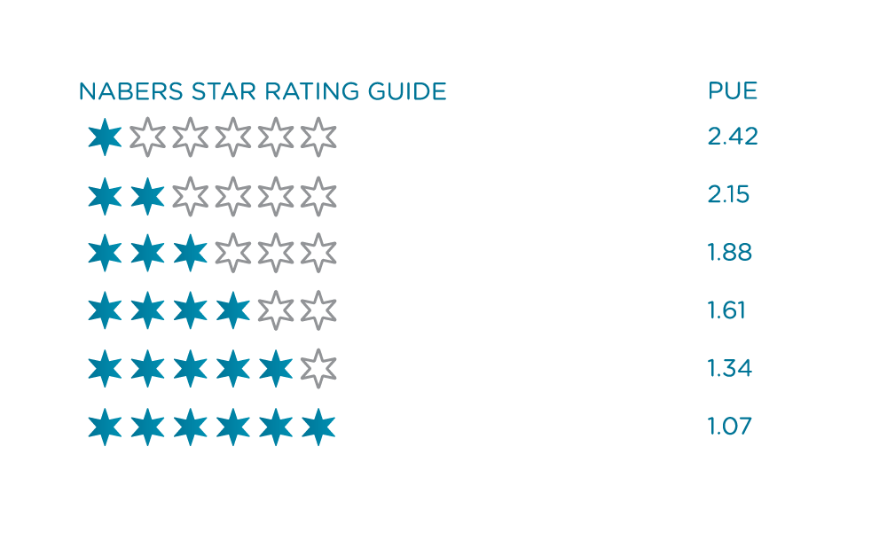 Figure 1: How NABERS star ratings correspond to PUE values. Equivalent NABERS star rating calculated from PUE values rounded to two decimal places. Borderline cases may have different PUE and NABERS ratings.