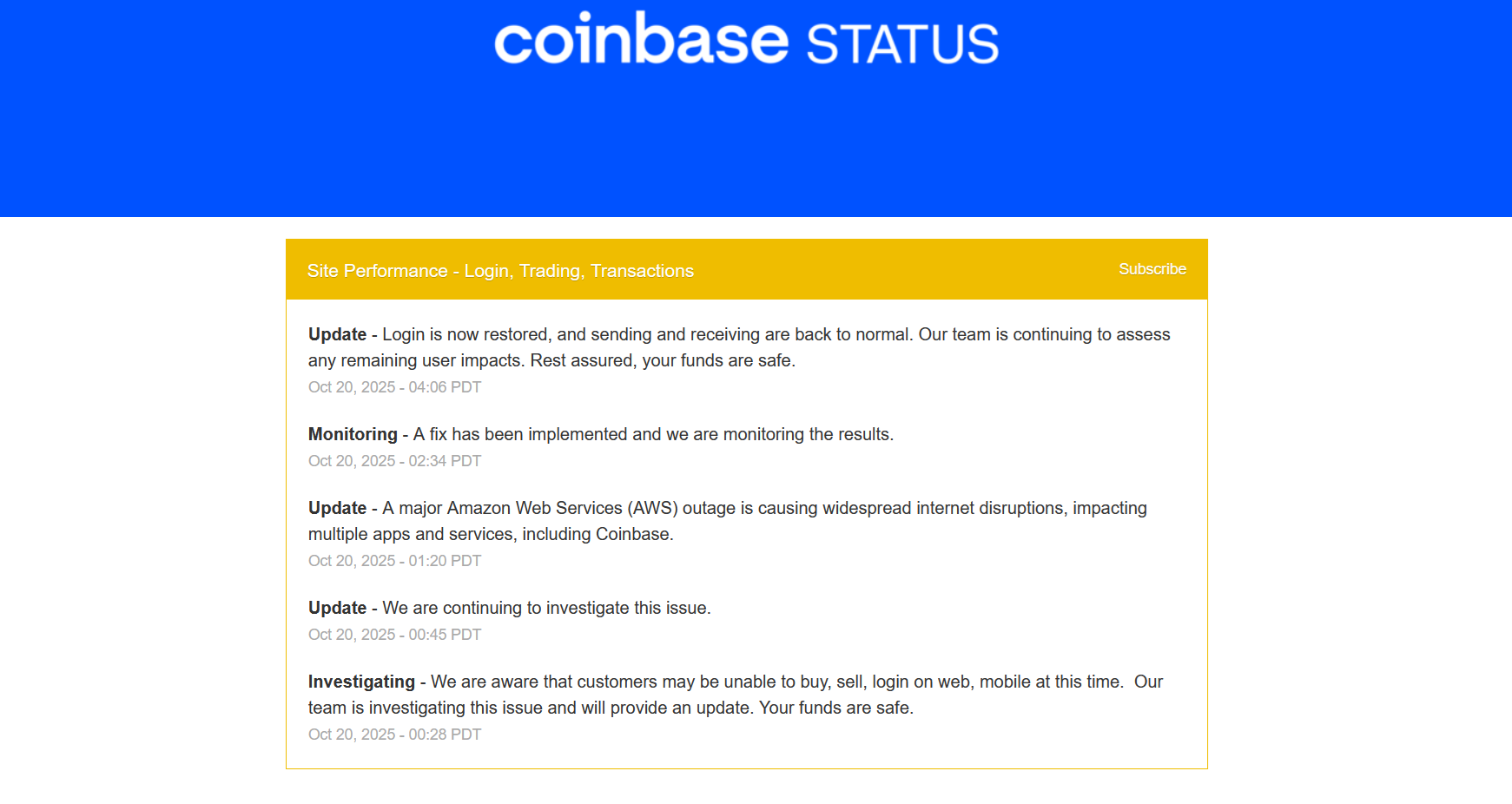 Cryptocurrency platform Coinbase also reported disruptions. At 1:20 PTD it said, “A major Amazon Web Services (AWS) outage is causing widespread internet disruptions, impacting multiple apps and services, including Coinbase.” However, by 4:06 it also indicated that services were returning to normalcy. At 4:06 it posted, “Login is now restored, and sending and receiving are back to normal. Our team is continuing to assess any remaining user impacts. Rest assured, your funds are safe.”