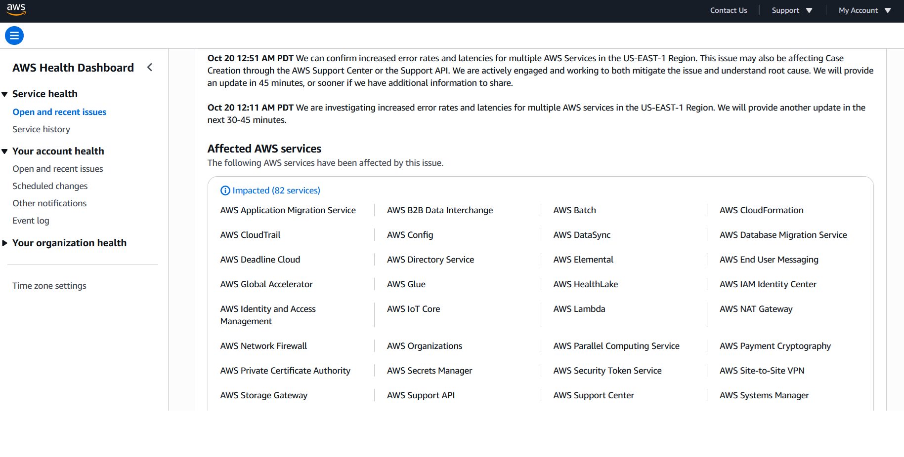 The outage impacted services like AWS Application Migration Service, AWS CloudFormation, AWS CloudTrail, AWS Lambda, AWS Network Firewall, AWS Organizations, AWS DynamoDB, AWS Transit Gateway, Amazon Location Service, AWS Support Center among others. Media reports say that Perplexity AI, Snapchat and Alexa were also impacted.