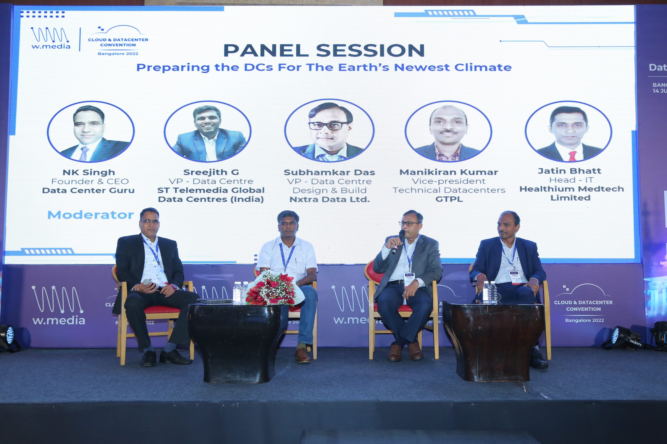In a panel discussion titled ‘Preparing the DCs for the Earth’s newest climate’ during W.Media’s Bangalore Cloud and Data Center Convention 2022. Thought leaders shared their insights on the initiatives and steps that need to be taken to shield the data center from global warming and how to be prepared for a more demanding situation. The session was moderated by NK Singh, Founder & CEO, Data Center Guru. The panelists included Sreejith G, VP – Data Centre, STT GDC India, Subhamkar Das, VP – Data Centre Design & Build, Nxtra Data Ltd and Manikiran Kumar, Vice-president Technical Datacenters, GTPL.