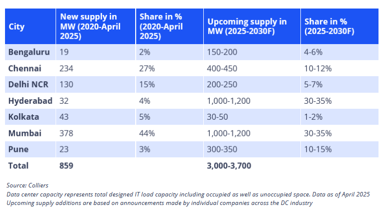 According to the report titled The digital backbone: Data center growth prospects in India the country’s data center capacity stood at 1,263MW as of April 2025, and that that the rapid capacity expansion has resulted in a real estate footprint of about 16 million sq ft across top seven data center markets of the country. In a press release Colliers said, “This growth is driven by the surge in demand for digital & cloud services, increasing adoption of Artificial Intelligence (AI) & Internet of Things (IoT), and higher internet penetration, supported by favorable government policies. ”It further said, “The industry has already seen investments to the tune of USD 14.7 billion since the beginning of 2020. These investments have been largely focused on land acquisition, project construction & development etc. In the next 5-6 years, amidst massive adoption of cloud computation and AI in India, DCs are likely to attract investments to the tune of US$ 20-25 billion.”