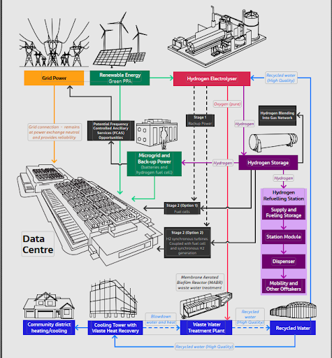 An innovative concept worth exploring is the co-location of data centers with wastewater treatment plants and hydrogen electrolyzers. This approach involves creating green hydrogen from renewable energy sources to split water (H2O) into hydrogen and oxygen. The hydrogen from the electrolyzer can be used in a fuel cell to power the data center, while the wastewater treatment plant can utilize the pure oxygen produced in the process for aerobic treatment. The waste heat recovery process is graphically illustrated in Figure 1 below.