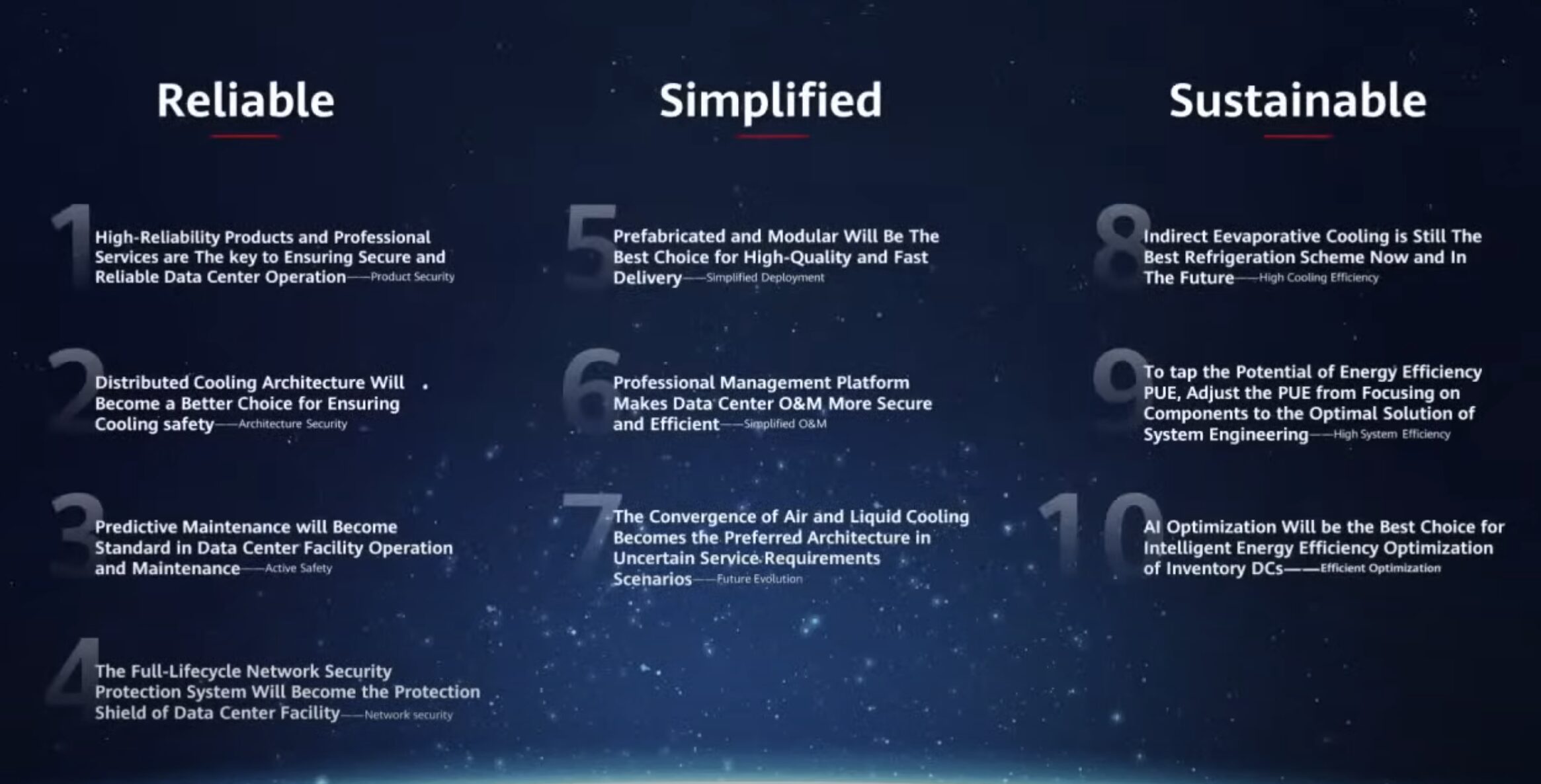 Key to these, at a conference unveiling the trends, Yao Quan, President of Huawei’s data center facility domain, defined the three characteristics of future data centers – reliable, simplified, and sustainable.
